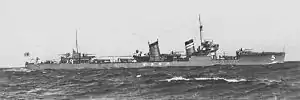 Early in the war, the No. 4 gun and the aft torpedo tubes were removed in exchange for four depth charge throwers and 18 depth charges. In addition 10 license-built 25 mm (0.98 in) Type 96 light AA guns were installed.[5] These changes increased their displacement to 1,499 long tons (1,523 t). Survivors had their light AA armament augmented to be between thirteen and twenty 25 mm guns and four 13.2 mm (0.5 in) Type 93 anti-aircraft machineguns by June 1944. These changes reduced their speed to 35 knots (65 km/h; 40 mph).[4]