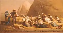 In 1850 Millet entered into an arrangement with Sensier, who provided the artist with materials and money in return for drawings and paintings, while Millet simultaneously was free to continue selling work to other buyers as well.[11] At that year's Salon, he exhibited Haymakers and The Sower, his first major masterpiece and the earliest of the iconic trio of paintings that would include The Gleaners and The Angelus.[12]