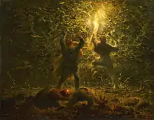 It was in Paris in the middle 1840s that Millet befriended Constant Troyon, Narcisse Diaz, Charles Jacque, and Théodore Rousseau, artists who, like Millet, would become associated with the Barbizon school; Honoré Daumier, whose figure draftsmanship would influence Millet's subsequent rendering of peasant subjects; and fr:Alfred Sensier, a government bureaucrat who would become a lifelong supporter and eventually the artist's biographer.[8] In 1847 his first Salon success came with the exhibition of a painting Oedipus Taken down from the Tree, and in 1848 his Winnower was bought by the government.[9]