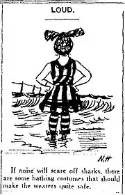 After the first fatality, newspaper cartoonists began using sharks as caricatures for political figures, German U-boats, Victorian morality and fashion, polio, and the deadly heat wave threatening the Northeast at the time. Fernicola notes, "Since 1916 was among the years that Americans were trying to break away from the rigidity and conservatism of the Victorian period, one comic depicted a risqué polka-dot bathing suit and advertised it as the secret weapon to keep sharks away from our swimmers." Another cartoon depicted "an exasperated individual at the end of a dock that displays a 'Danger: No Swimming' sign and mentions the three most emphasized 'danger' topics of the day: 'Infantile Paralysis (polio), Epidemic Heat Wave, and Sharks in the Ocean'." The cartoon is entitled "What's a Family Man to Do?"[62] With World War I ongoing in 1916 and America's growing distrust of Germany, cartoonists depicted U-boats with the mouth and fins of a shark assaulting Uncle Sam while he wades in the water.[63]