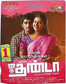 Jigarthanda (transl. Cold-hearted) is a 2014 Indian Tamil-language action thriller film[1] written and directed by Karthik Subbaraj. Produced by Kathiresan's Group Company, it features Siddharth as Karthik, an aspiring filmmaker, who gets a chance to make a film, based on gangsterism. So, he goes to Madurai to research about Assault Sethu (played by Bobby Simha), a merciless gangster who will not hesitate to murder those who try to even write about him.[2] The movie was reported to be inspired by the 2006 South Korean movie A Dirty Carnival.[3][4][5] But this was turned out to be untrue. The supporting cast for the film includes Lakshmi Menon, Karunakaran and Guru Somasundaram.[6][7] Gavemic U Ary was the film's cinematographer, making his debut in Tamil cinema, and Vivek Harshan was the film's editor.[8] Santhosh Narayanan composed the songs and background score.[9]