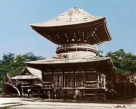 Until the Meiji period (1868–1912), the jingū-ji (神宮寺, shrine temple) were places of worship composed of a Buddhist temple and a Shintō shrine, both dedicated to a local kami.[1] These complexes were born when a temple was erected next to a shrine to help its kami with its karmic problems. At the time, kami were thought to be also subjected to karma, and therefore in need of a salvation only Buddhism could provide. Having first appeared during the Nara period (710–794), jingū-ji remained common for over a millennium until, with few exceptions, they were destroyed in compliance with the Kami and Buddhas Separation Act of 1868. Seiganto-ji is a Tendai temple part of the Kumano Sanzan Shinto shrine complex, and as such can be considered one of the few shrine-temples still extant.[2]