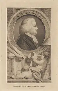 While a student Dunning became close to Lloyd Kenyon and John Horne Tooke. He was called to the bar on 2 July 1756, and joined the western circuit. For several years after his call he had little success. In 1762, however, John Glynn, one of the leading counsel on the circuit, suddenly fell ill, and placed his briefs in Dunning's hands. By 1764 he was making £2,000 a year, helped by his pamphlet,[4] drawn up by Dunning on behalf of the directors of the English East India Company. In 1765 he established his legal reputation by his arguments against the legality of general warrants in the case of Leach v. Money.[3]