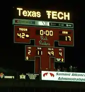 The unique Double T scoreboard modeled in the fashion of Texas Tech's logo is emplaced on the roof of the athletic department offices in the south end zone and was installed prior to the beginning of the 1978 season. The scoreboard has remained in place through multiple stadium renovations due to its iconic and symbolic value, and received upgraded white LED panel installations in 2013.[24][25]