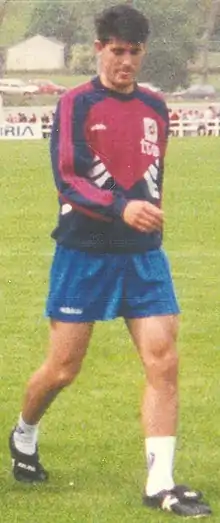 The peak of Caminero's career took place from 1993–94, when he moved to Atlético Madrid. He was a key member of the squad that won an historical double in 1995–96, contributing with nine league goals in 37 games;[2] accordingly, after the season, he was given the Spanish Footballer of the Year award by both the Madrid newspaper El País and the prestigious football magazine Don Balón, being the only Atlético player to win both awards during one season,[3] and netted a career-best 14 goals the following campaign.[4]