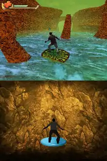 The gameplay of the game is based solely around the events of the movie in an open world environment, allowing the player to control out-of-control mine carts, and rafts throughout out the center of the Earth.[3] THQ also expanded the environment of the center of the Earth to allow the player to further journey throughout the open environment.[3] The game also features three playable characters: Trevor, Sean and Hannah, who each have a special ability.[4] Progress in the game is based on the use of checkpoints.[5] Each time a character dies, they return to the last checkpoint and continue from there.[5]Journey to the Center of the Earth allows the player to control movements with the bottom screen while the character reacts on the upper screen. IGN said this about the game: "Horrible controls make the game an endless pattern of accidentally jumping into bottomless pits."[5]