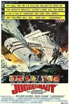 Juggernaut is a 1974 British crime suspense film starring Richard Harris, Omar Sharif, and Anthony Hopkins. The film, which was directed by Richard Lester,[1] was largely shot on location aboard the TS Hamburg in the North Sea. It was inspired by real events aboard QE2 in May 1972 when Royal Marines from the Special Boat Service were parachuted onto the ship because of a bomb hoax.[2]