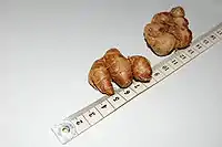 Unlike the similar Boesenbergia rotunda (Thai กระชาย krachai), K. galanga is not commonly used in Thai cuisine, but can be bought as a dried rhizome or in powder form at herbal medicine stalls. It is known in Thai as proh horm (เปราะหอม) or waan horm (ว่านหอม), and in Khmer as prâh (ប្រោះ) or prâh krâ-oup (ប្រោះក្រអូប). It is also used in Chinese cooking and Chinese medicine, and is sold in Chinese groceries under the name sha jiang (Chinese: 沙 姜; pinyin: shajiang),[1] while the plant itself is referred to as shan nai (Chinese: 山 柰; pinyin: shannai).[2] Kaempferia galanga has a peppery camphorous taste.[1]