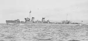 The Kamikaze-class destroyers (神風型駆逐艦, Kamikazegata kuchikukan) were a class of nine destroyers of the Imperial Japanese Navy.[1] Some authors consider the Nokaze, Kamikaze and Mutsuki classes to be extensions of the Minekaze-class destroyers, and the Kamikaze class is sometimes referred to as the "Kiyokaze class" to distinguish it from the earlier World War I-era destroyer class of the same name. Obsolete by the beginning of the Pacific War, the Kamikazes were relegated to mostly secondary roles. Most ultimately were lost to U.S. submarines.