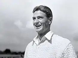 Miller was rested for the next match against Lancashire, which was drawn after the first day was lost to rain.[12][13] He returned against Nottinghamshire and scored 51 of Australia's total of 400. Miller took a wicket in each innings, including that of Test batsman Reg Simpson, to end with 2/67 as Australia drew its second consecutive match.[35] In the next match, against Hampshire, Miller bowled 19 overs without reward, taking 0/39 as the home team batted first and scored 195.[36] In reply, Australia was in trouble after rain turned the pitch into a sticky wicket. Miller came in at 2/38 and launched a counter-attack, scoring 39 of the 53 runs added before he fell with the score at 5/91. The Australians were all out for 117, conceding a first innings lead of 78,[36] the first time during the tour that they had been behind on the first innings.[12] Miller's top score of 39 included three consecutive sixes from the bowling of Charlie Knott, who took 5/57.[37] In Hampshire's second innings, he took 5/25 and bowled three of his victims.[36] The tourists dismissed Hampshire for 103, leaving a target of 182, which Australia achieved with eight wickets to spare without Miller having to bat.[38] He was rested for the match against Sussex at Hove,[38] after six consecutive days of cricket.[12] In its last match before the Tests, Australia completed an innings victory in just two days.[39]