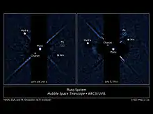 Kerberos was discovered by researchers of the Pluto Companion Search Team using the Hubble Space Telescope on 28 June 2011, using the Wide Field Camera 3, during an attempt to find any rings that Pluto might possess.[10][11] The search for rings was motivated in part by a desire to avoid damage to New Horizons when it passed through the Pluto system in July 2015.[12] Further observations were made on 3 and 18 July 2011 and Kerberos was verified as a new moon on 20 July 2011.[1][13] It was later precovered or identified in earlier archival Hubble images from 15 February 2006 and 25 June 2010, though Kerberos was obscured by diffraction spikes in those images.[14] Kerberos's brightness is only about 10% of that of Nix, and it was only found because the discovery team took eight-minute exposures; earlier observations had used shorter exposures.[15] It was officially designated S/2011 (134340) 1,[1] and was informally referred to as P4.[15]