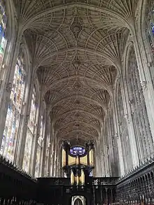 Henry VI planned a university counterpart to Eton College (whose Chapel is very similar, but not on the scale intended by Henry). The King decided the dimensions of the Chapel. Reginald Ely was most likely the architect and worked on the site since 1446.[6] Two years earlier Reginald was charged with sourcing craftsmen for the Chapel's construction.[6] He continued to work on the site until building was interrupted in 1461, having probably designed the elevations.[6] The original plans called for lierne vaulting, and the piers of the choir were built to conform with them.[6] Ultimately, a complex fan vault was constructed instead.[6] Reginald probably designed the window tracery at the extreme east of the church's north side: the east window of the easternmost side chapel, which unlike the Perpendicular style of the others is in curvilinear Gothic style.[6] The priest and later bishop Nicholas Close (or Cloos) was recorded as the "surveyor", having been the curate of St John Zachary, a church demolished to make way for the Chapel.[7][8][9]