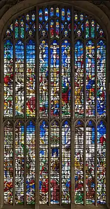 The eventual installation of the Rubens was also not without problems: once seen beneath the east window, a conflict was felt between the picture's swirling colours and those of the stained glass.[13] The Rubens was also a similar shape to the window, which "dwarfed it and made it look rather like a dependent postage stamp".[14] Plain shutters were proposed, one on each side, to give it a triptych shape (although the picture was never part of a triptych) and lend it independence of form, which is how one sees the Rubens today. The installation was designed by architect Sir Martyn Beckett, who was "philosophical about the furore this inevitably occasioned - which quickly became acceptance of a solution to a difficult problem."[15]