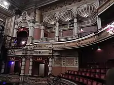 The theatre provides seating on four levels - Stalls, Grand Circle, Upper Circle and Gallery. Matcham was famous for his innovative style of cantilever construction of the individual seating tiers, which virtually eliminated the need for supporting pillars, and the King's was no exception, with reasonable sightlines from most seats. Victorian and Edwardian theatres were almost always built to segregate patrons at each level, although subsequent modernisations often eradicate this. This has thus far not been the case in the King's, which still has separate entrances, some of which have traces of former pay boxes, now disused. The standard of seating and decoration is also less luxurious as you get further up the house. The Stalls and Grand Circle are accessed via the small main foyer, which still impresses with its barrel vaulted ceiling, horizontal bands of red and white marble, and decorative plasterwork on the ceilings, including caryatids. The Upper Circle is accessed via a door to a stairwell to the left of the main Bath Street entrance. The Gallery is accessed via a staircase at the back of the building with its own entrance on Elmbank Street.
