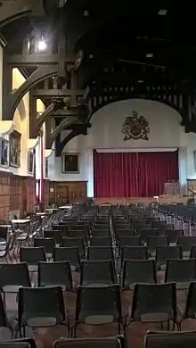 By 1936 the old building on New Street had become a fire risk, and plans were made by the Governors and the then Headmaster, Edwin Thirlwall England, to move to a new site at Edgbaston Park Road/Bristol Road, in Edgbaston, along with the girls' school. Ironically, the temporary buildings erected on the new site in 1936 burnt down. The school was forced to move, if only for a short time, to the University of Birmingham's Great Hall and surrounding buildings until new temporary buildings could be erected. The move was complicated by the outbreak of the Second World War, and the subsequent evacuation of the pupils to Repton School for a short period. By 1940 enough of the new buildings designed by Holland W. Hobbiss had been built for the school to begin lessons. In 1945 the schools became direct grant grammar schools, which meant that the Governors had to relinquish some control over the running of the school.[6] The schools were finally completed around 1948, although the 1950s saw a period of expansion under the Chief Master Ronald G. Lunt, appointed 1952, including the construction of a swimming pool and the building of a chapel from a specially salvaged portion of the upper corridor of the New Street building.[7] In 1976 the two schools became, once again, independent schools, due to the termination of the Direct Grant scheme by the then Prime Minister Harold Wilson.[8][9] The school remains independent and is still on the Edgbaston site.[10]