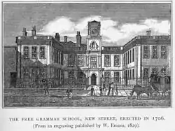The Foundation was created on 2 January 1552 by Royal Charter of King Edward VI together with £20 per annum returned by the Crown for educational purposes. Five years earlier in 1547 the Act of Suppression, part of the wider Dissolution of the Monasteries, provided for the confiscation of all assets of religious guilds except an amount of land with an annual income of £21 (two thirds of the original lands) if the guild supported a school. The Guild of the Holy Cross in Birmingham had no school, but persuaded the Earl of Northumberland (also the lord of the manor of Birmingham) to release the land for the creation of a school. The charter of the free Grammer Schole of King Edward VI was issued on 2 January 1552, and the school came into being in the former guild building on New Street. By the 1680s there were neer 200 boys in the school and a Petty School (a feeder school) had been established by the foundation.[3]
