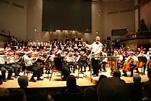 There is a separate building on site housing the Music Department, with facilities including a recital/rehearsal auditorium and a computer laboratory equipped with keyboard input. In addition, the school supports two full orchestras (in association with King Edward's High School for Girls) the more advanced of which has performed such works as Dvořák's Symphony No. 9, "From the New World". There are also two wind/brass ensembles in association with KEHS, and the senior members of both schools can join the Choral Society, a choir of 80-100 people which has sung such works as Carl Orff's Carmina Burana and Karl Jenkins's The Armed Man. KES also has its own choir, which sings at the Christmas carol service held in St. Philip's Cathedral in the centre of Birmingham, and at the Christmas and summer concerts. The school holds four concerts every year: three at the school site and one in the summer at the Symphony Hall, Birmingham. The Drama Society at KES/KEHS performs a junior play, senior play or musical, and syndicate play (organised solely by pupils) and participates in the Shakespeare Schools Festival (for pupils in the Fourths and Fifths).