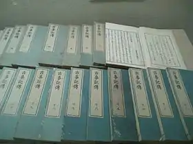 The Kojiki received its most serious study and exposition in the hands of Motoori Norinaga, who obtained a copy of the Kan'ei printed edition in 1754. After meeting Mabuchi in 1763, Norinaga began to devote his efforts to an in-depth scholarly study of the text. A monumental 44-volume study of the Kojiki called Kojiki-den (古事記伝, "Commentary on the Kojiki"), composed over a thirty-four year period (1764-1798), was the fruit of his labor.[15] With Norinaga, the Kojiki assumed an importance equal to the Nihon Shoki; in fact, in his view the Kojiki was a more trustworthy source for ancient Japanese traditions than was the Shoki precisely because it was free of "Chinese mentality." He viewed the Kojiki as a true account of actual events that when read correctly, could reveal Japan in its pristine, ideal state as a community where the kami, the emperor and the people lived in harmony.[15][18] Norinaga's work was carried on in different directions by his disciple Hirata Atsutane and his rivals Fujitani Mitsue (1781-1849)[19] and Tachibana Moribe (1768-1823),[20] who each produced commentaries and treatises on the text.[15]