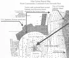 Korean Air Lines Flight 007 (also known as KAL007 and KE007)[note 2] was a scheduled Korean Air Lines flight from New York City to Seoul via Anchorage, Alaska. On September 1, 1983, the South Korean airliner servicing the flight was shot down by a Soviet Su-15 interceptor. The Boeing 747 airliner was en route from Anchorage to Seoul, but due to a navigational mistake made by the KAL crew the airliner deviated from its original planned route and flew through Soviet prohibited airspace about the time of a U.S. aerial reconnaissance mission. The Soviet Air Forces treated the unidentified aircraft as an intruding U.S. spy plane, and destroyed it with air-to-air missiles, after firing warning shots which were likely not seen by the KAL pilots.[2] The Korean airliner eventually crashed in the sea near Moneron Island west of Sakhalin in the Sea of Japan. All 269 passengers and crew aboard were killed, including Larry McDonald, a United States Representative from Georgia. The Soviets found the wreckage under the sea on September 15, and found the flight recorders in October, but this information was kept secret until 1993.