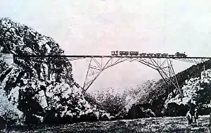 The surveyed route of the line crossed the Kowie River at Blaauwkrantz, where a high bridge needed to be constructed. It had been estimated that the line would be completed by the end of 1883, but since the construction of the Blaauwkrantz Bridge delayed progress, the 43-mile long (69-kilometre) line was only partially opened to traffic from Port Alfred as far as Blaauwkrantz on 24 December 1883. Here, passengers had to disembark and complete the journey to Grahamstown on the post cart.[2][3][4]