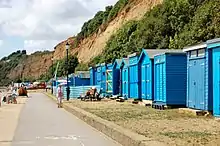 Lake is a seaside village situated above the cliffs on Sandown bay, it stands at an elevation of 63 feet (19 m) above sea-level.[5] Lake's beach or 'Welcome Beach' has golden sands and reached by a steep path down the sandstone cliffs to the Revetment.[6] It has two cafes (Hinks and Strollers), beach huts, a Sea Scout hut and inshore lifeboat.
