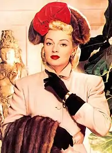 Meanwhile, publicity over Turner's remarriage to Crane led MGM to play up her image as a sex symbol in Slightly Dangerous (1943), with Robert Young, Walter Brennan and Dame May Whitty, in which she portrayed a woman who moves to New York City and poses as the long-lost daughter of a millionaire.[105] Released in the midst of Turner's pregnancy, the film was financially successful[106] but received mixed reviews, with Bosley Crowther of The New York Times writing: "No less than four Metro writers must have racked their brains for all of five minutes to think up the rags-to-riches fable ... Indeed, there is cause for suspicion that they didn't even bother to think."[107] Critic Anita Loos praised Turner's performance in the film, writing: "Lana Turner typifies modern allure. She is the vamp of today as Theda Bara was of yesterday. However, she doesn't look like a vamp. She is far more deadly because she lets her audience relax."[108]