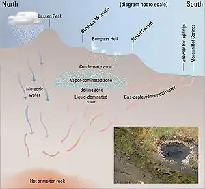Lassen Peak remains an active volcano,[64] as volcanic activity including fumaroles (steam vents), hot springs, and mudpots can be found throughout Lassen Volcanic National Park. Their activity varies based on the season; during the spring, when meltwater is more abundant, fumaroles and pools of water have lower temperatures, while mudpots have more fluid mud supplies. During summer and droughts, they become drier and hotter, since they cannot be cooled by ground water. Geothermal activity can be observed at Bumpass Hell, Little Hot Springs Valley, Pilot Pinnacle, Sulphur Works, Devils Kitchen, Boiling Springs Lake, and Terminal Geyser, as well as the Morgan and Growler Hot Springs south of the national park in Mill Canyon. These are produced by the boiling of underground bodies of water, which generates steam. At Bumpass Hell, these features are at their most vigorous, with temperatures reaching 322 °F (161 °C) at Big Boiler, the park's biggest fumarole and one of the hottest hydrothermal fumaroles in the world. Because of their acidic conditions and heat, none of these hydrothermal bodies are safe for bathing except for at Drakesbad Guest Ranch.[34] Fumaroles near Lassen Peak in particular remained active through the 1950s, but have grown weaker over time;[70] they can still be found among the volcano's summit craters.[78] These hydrothermal features are monitored continuously for their physical and chemical conditions by the United States Geological Survey.[34]