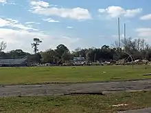 This large wedge tornado was caught on television tower cameras as it moved through Mobile. The tornado initially touched down at 2254 UTC (4:54 p.m. CST) along Dauphin Island Parkway, just northwest of Interstate 10 and produced damage consistent with an EF1 tornado. Several commercial retailers and numerous homes were damaged, including loss of roof at many of these structures. Several outbuildings were destroyed, numerous structures had windows blown out, and Murphy High School sustained significant damage.[76] Damage at the high school included six portable classrooms being leveled, the roofs being torn off of the auditorium and band building, and other roofs on the school being lifted off the building, only to be deposited back onto the building.[77] The tornado continued northward and strengthened, producing EF2 damage to several homes and Trinity Episcopal Church.[76] Wind speeds were estimated to reach a maximum of 135 mph.[78] At the church, part of a new slate roof was blown into the parking lot and a large portion of an exterior brick wall was knocked out, leaving a portion of the building visible from the outside.[79] The tornado widened to its widest point of 200 yards (180 m) in this area.[76][80]