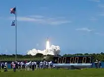 ![]() The flagpole and countdown clock at dawn before the STS-114 launch in July 2005 | |