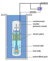 PIUS, standing for Process Inherent Ultimate Safety, was a Swedish design designed by ASEA-ATOM. It is a concept for a light-water reactor system.[8] Along with the SECURE reactor,[9] it relied on passive measures, not requiring operator actions or external energy supplies, to provide safe operation. No units were ever built.