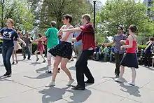 Lindy Hop is sometimes referred to as a street dance, referring to its improvisational and social nature. In 1932, twelve-year-old Norma Miller did the Lindy Hop outside the Savoy Ballroom with her friends for tips.[1] In 1935, 15,000 people danced on Bradhurst Avenue for the second of a dance series held by the Parks Department. Between 147th and 148th street, Harlem "threw itself into the Lindy hop with abandon" as Sugar Hill residents watched from the bluffs along Edgecombe Avenue.[2]