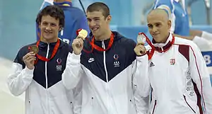 American swimmer Michael Phelps was the most successful athlete, winning eight gold medals and setting a new record for most golds won in a single edition of the Olympics (the previous record, seven, had been set in 1972 by Mark Spitz).[19] Phelps also set a new record for most career gold medals (14), and his 16 total medals were ranked second all-time behind Soviet gymnast Larisa Latynina (18) at the time. In 2012 Phelps set a record for most total medals.[20] Several records for career medals in a sport were tied or surpassed, including cycling (Bradley Wiggins of the United Kingdom won two gold, tied for record with six career medals); judo (Ryoko Tani of Japan won a bronze, five career medals); softball (Laura Berg of the United States won a gold and Natalie Ward, Melanie Roche and Tanya Harding of Australia won a bronze; all have four career medals); swimming (Michael Phelps, 16 career medals); taekwondo (Steven López of the United States won a bronze and Hadi Saei of Iran won a gold, both three career medals); and table tennis (Wang Nan of China won a gold and silver medal, five career medals).[20]