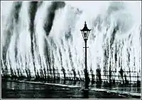 - September 21, 1938 — The New England hurricane of 1938 (also called "The Long Island Express") makes landfall on Suffolk County (Long Island) as a category 3 hurricane on the Saffir–Simpson hurricane scale.[25] Wind gusts of 125 mph (200 km/h) and storm surge of 18 feet (5 m) washes across part of the island.[26] In New York 60 deaths and hundreds of injuries were attributed to the storm.[27] In addition, 2,600 boats and 8,900 houses are destroyed.[28] Throughout New England the hurricane killed over 682 people,[29] damaged or destroyed over 57,000 homes, and caused property losses estimated at $4.7 billion (2005 US dollars).[30]