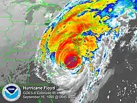 - September 16, 1999 — Hurricane Floyd produces rainfall up to 13 inches (325 mm) and wind gusts of up to 60 mph (95 km/h) affect Southeastern New York. Severe flooding results from the storm, killing two people and causing an early estimate of $14.6 million (1997 USD, $18 million 2007 USD), although it is reported that damage could total to far more than that. One of the deaths occurred when a person was swept into a flooded river.[70][71]