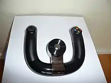 The Xbox 360 Wireless Racing Wheel was introduced by Microsoft at E3 2006. Released in November 2006, the force feedback steering wheel controller includes the standard gamepad buttons and floor-mounted accelerator and brake pedals. Although the wheel is capable of running off the rechargeable battery pack, use of the force feedback and active resistance features requires an external AC adapter.[21]