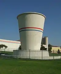 The world's largest "paper" cup in front of what was once the Lily-Tulip manufacturing company, later Sweetheart Cup Company.[17] Actually made of poured concrete, the cup stands about 68.1 feet (20.8 m) tall. |