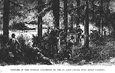 | USS Shawsheen | American Civil War: The gunboat was disabled and captured by Confederate States Army troops on the James River in Virginia, Confederate States of America. The Confederate troops set her on fire when two United States Navy ironclads approached, and she exploded when the flames reached her ammunition magazine.[9][27] | |