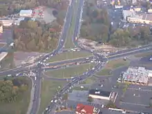 As suburban and rural populations grew New Jersey's traffic circles became outdated. The increased number of drivers on the roads resulted in traffic circles being more likely to hinder traffic than help it. Increased number of vehicles and faster traffic speeds made traffic circles more dangerous and accidents common.[1] Many traffic circles became notorious for having frequent accidents and being confusing, especially for non-locals.[4][5] Starting around the 1970s, the New Jersey Department of Transportation began phasing out traffic circles.[6] Common methods of eliminating traffic circles are building a road through the circle, adding traffic lights, and the use of grade separation.[7]