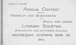 The literary societies at Washington & Jefferson College, and its predecessors Jefferson College, Washington College, Canonsburg Academy, and Washington Academy, developed in order to make students more familiar with debate, literature, oratory, and writing.[1] According to W.M. McClelland, Professor of English Language and Literature at Washington & Jefferson College, the literary societies existed to "make young men in college familiar with parliamentary rules, with the perennial themes of human discussion, and to give them a readier use of their mother tongue."[1] Typical early activities include the presentation of dialogues, translations of passages from Greek or Latin classics, and extemporaneous speaking.[1] Later, the literary societies began to present declamations.[1]
