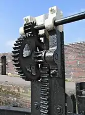 Winding gear is the mechanism which allows paddles to be lifted (opened) or lowered (closed). Typically, a square-section stub emerges from the housing of the winding gear. This is the axle of a sprocket ("pinion") which engages with a toothed bar ("rack") attached by rodding to the top of the paddle. A lock-keeper or member of the boat's shore crew engages the square socket of their windlass (see below) onto the end of the axle and turns the windlass perhaps a dozen times. This rotates the pinion and lifts the paddle. A pawl engages with the rack to prevent the paddle from dropping inadvertently while being raised, and to keep it raised when the windlass is removed, so that the operator can attend to other paddles. Nowadays it is considered discourteous and wasteful of water to leave a paddle open after a boat has left the lock, but in commercial days it was normal practice. To lower a paddle the pawl must be disengaged and the paddle wound down with the windlass. Dropping paddles by knocking the pawl off can cause damage to the mechanism; the paddle gear is typically made of cast iron and can shatter or crack when dropped from a height. In areas where water-wastage due to vandalism is a problem, (for example the Birmingham Canal Navigations), paddle mechanisms are commonly fitted with vandal-proof locks (nowadays rebranded "water conservation devices") which require the boater to employ a key before the paddle can be lifted. The keys are officially known as "water conservation keys", but boaters usually refer to them as T-keys, from their shape; handcuff keys because the original locks, fitted on the Leeds and Liverpool Canal, resembled handcuffs; Leeds and Liverpool Keys after that canal; or simply Anti-Vandal Keys.
