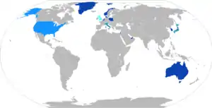 The United States is the primary customer and financial backer, with planned procurement of 1,763 F-35As for the USAF, 353 F-35Bs and 67 F-35Cs for the USMC, and 273 F-35Cs for the USN.[12] Additionally, the United Kingdom, Italy, the Netherlands, Canada, Turkey, Australia, Norway, and Denmark have agreed to contribute US$4.375 billion towards development costs, with the United Kingdom contributing about 10% of the planned development costs as the sole Tier 1 partner.[68] The initial plan was that the U.S. and eight major partner nations would acquire over 3,100 F-35s through 2035.[69] The three tiers of international participation generally reflect financial stake in the program, the amount of technology transfer and subcontracts open for bid by national companies, and the order in which countries can obtain production aircraft.[70] Alongside program partner countries, Israel and Singapore have joined as Security Cooperative Participants (SCP).[71][72][73] Sales to SCP and non-partner nations, including Belgium, Japan, and South Korea, are made through the Pentagon's Foreign Military Sales program.[74][7] Turkey was removed from the F-35 program in July 2019 over security concerns.[75][76][N 9]