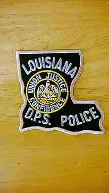 The Louisiana State Police is the state police agency of Louisiana, which has jurisdiction anywhere in the state, headquartered in Baton Rouge.[3] It falls under the authority of the Louisiana Department of Public Safety & Corrections. It is officially known in that organization as the Office of State Police. The badge worn by its troopers is very distinctive in that it is shaped like the state of Louisiana. The Louisiana State Police is a premier law enforcement agency in Louisiana and was accredited by the Commission on Accreditation for Law Enforcement Agencies (CALEA) from 2003 to 2008.[4] The agency voluntarily ceased its association with CALEA in 2008.