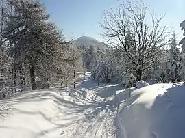 ![]() Cross-country skiing route along the Lusatian Mountains' main ridge. The mountain in the background is the Lausche. | |