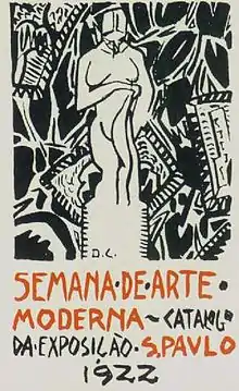 In 1922, while preparing Paulicéia Desvairada for publication, Andrade collaborated with Malfatti and Oswald de Andrade in creating a single event that would introduce their work to the wider public: the Semana de Arte Moderna (Week of Modern Art).[8] The Semana included exhibitions of paintings by Malfatti and other artists, readings, and lectures on art, music, and literature. Andrade was the chief organizer and the central figure in the event, which was greeted with skepticism but was well-attended. He gave lectures on both the principles of modernism and his work in Brazilian folk music, and read his "Extremely Interesting Preface." As the climactic event of the Semana, he read from Paulicéia Desvairada. The poems' use of free verse and colloquial São Paulo expressions, though related to European modernist poems of the same period, were entirely new to Brazilians.[11] The reading was accompanied by persistent jeers, but Andrade persevered, and later discovered that a large part of the audience found it transformative. It has been cited frequently as the seminal event in modern Brazilian literature.[17]