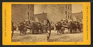In 1823 Pembina was found to be just south of the Canada–United States border and in 1844 Norman Kittson opened a successful trading post at Pembina in competition with the Hudson's Bay Company at Red River. By 1849 the Hudson's Bay Company had lost its fur trade monopoly (the result of the Sayer Trial) and the Métis could now freely sell their furs.[25] As the price of buffalo robes increased so did the number of carts heading south from Pembina to St. Paul, Minnesota each year: from 6 carts in 1844 to 400 carts in 1855, 600 to 800 carts in 1858 and 2,500 carts in 1869. Most of this freight was in buffalo robes (25,000 in 1865 alone).[45]