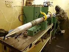 Disposal operations for the M55 are made more difficult because of the rocket's design.[1] The rocket propellant was a double base composition nitroglycerin (NG) and nitrocellulose (NC) propellant.[2] Besides the NG and NC, M28 contains 2-nitrodiphenylamine (NDPA) as a stabilizer.[4] The rocket propellant cannot be removed from the warhead without cutting open the rocket.[5]