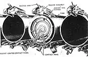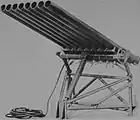 Operational service showed some drawbacks in the M8's performance; ground launch resulted in the rockets' fin stabilizers proving ineffective,[9] reducing the accuracy of the rocket; despite this, it was considered an effective barrage weapon.[10] Due to the lack of accuracy, when ground-launched, it was being launched from large multiple launchers; the most commonly used being eight- and 60-tube launchers, called "xylophones" and "calliopes" respectively.[3][6] The officially-named U.S. Army T34 Calliope launch system was mounted on top of a M4 Sherman tank; once fired, the launcher could be detached and discarded, allowing the tank to be used in conventional combat, while the "xylophone", officially the T27, was carried on a 2½-ton truck's cargo bed.[3] A 120-round launcher, designated T44, and a 144-round T45 launcher were also developed; these were intended for use by the United States Navy, being mounted on DUKW amphibious vehicles and LST amphibious warfare vessels. Single- and twin-14-round launchers were also developed.[3]