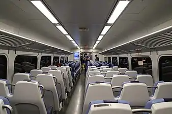 The M9s are equipped with numerous customer amenity improvements over their predecessors. The cars are equipped with closed loop seat armrests similar to those on the M8s, wider seats, electrical outlets on both sides of a car in each row of seats, four 32-inch multimedia screens in each car, four to six additional seats per married pair, as well as powered doors on the "B" end of each car. The flip seats in the cars are equipped with a suspension system to prevent them from slamming. The cars also feature exterior destination signs that are visible on each end as the train approaches a station, to let passengers know where the train is going. All M9s will be equipped with positive train control (PTC) and CCTV cameras that allow the train crew to view the passenger areas of the train. Like the M7s and M8s, the M9s feature automated announcements and LED displays that show the current station, the following station, and the train's destination, external public address speakers, and electronic destination signs. Additionally, the internal and external destination signs also display the car's position within a train (for example: "Car 1 of 8"), allowing passengers to know where they are in case of stations with shorter platforms.[6] The M9 and M9A fleets incorporate new announcements that are easier to hear and understand, and differ from the M7/M7A, M8, and C3 fleets. The M9As also feature USB ports installed in each alternating current electrical outlet, as well as powered bathroom doors, stainless steel urinals in each bathroom, and Gorilla Glass side windows that do not haze, fade or crystallize.[6]