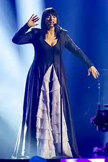 Kaliopi made several appearances across Europe to specifically promote "Dona" as the Macedonian Eurovision entry. Between 21 March and 30 March, Kaliopi completed a tour of the ex-Yugoslav region, visiting Belgrade, Sarajevo, Ljubljana and Zagreb and giving interviews to media outlets and appearing during talk show programmes to discuss her Eurovision participation; Kaliopi performed "Dona" during the RTV SLO1 programme Vikend paket on 27 March.[9][10] On 3 April, Kaliopi performed during the Eurovision Pre-Party, which was held at the Izvestia Hall in Moscow, Russia and hosted by Dmitry Guberniev.[11] On 9 April, Kaliopi performed during the Eurovision in Concert event which was held at the Melkweg venue in Amsterdam, Netherlands and hosted by Cornald Maas and Hera Björk.[12] On 12 April, Kaliopi completed promotional activities in Bulgaria.[13] On 17 April, Kaliopi performed during the London Eurovision Party, which was held at the Café de Paris venue in London, United Kingdom and hosted by Nicki French and Paddy O'Connell.[14] On 20 April, Kaliopi completed promotional activities in Albania where she provided media outlets with interviews, appeared during the TVSH programme Kolor and recorded a performance of "Dona" for the TV Klan programme E diela shqiptare, which was broadcast on 24 April.[15][16]