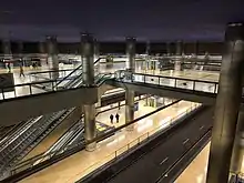 The Chamartín metro station serves Line 1 and Line 10, and is located directly below the railway station, accessible by a short sheltered outdoor passage.[2][3] It has four levels: two mezzanines, and two track levels, with mezzanines between track levels. The upper mezzanine has a few shops and fare gates to enter the station proper, and is connected to the exit. The lower mezzanine currently serves as a way for riders to change direction on either line. The upper track level supports Line 10, while the lower track level supports Line 1, and each track level has an extra trench for two more tracks. These trenches are planned to carry Line 11 and Line 14 in the future.